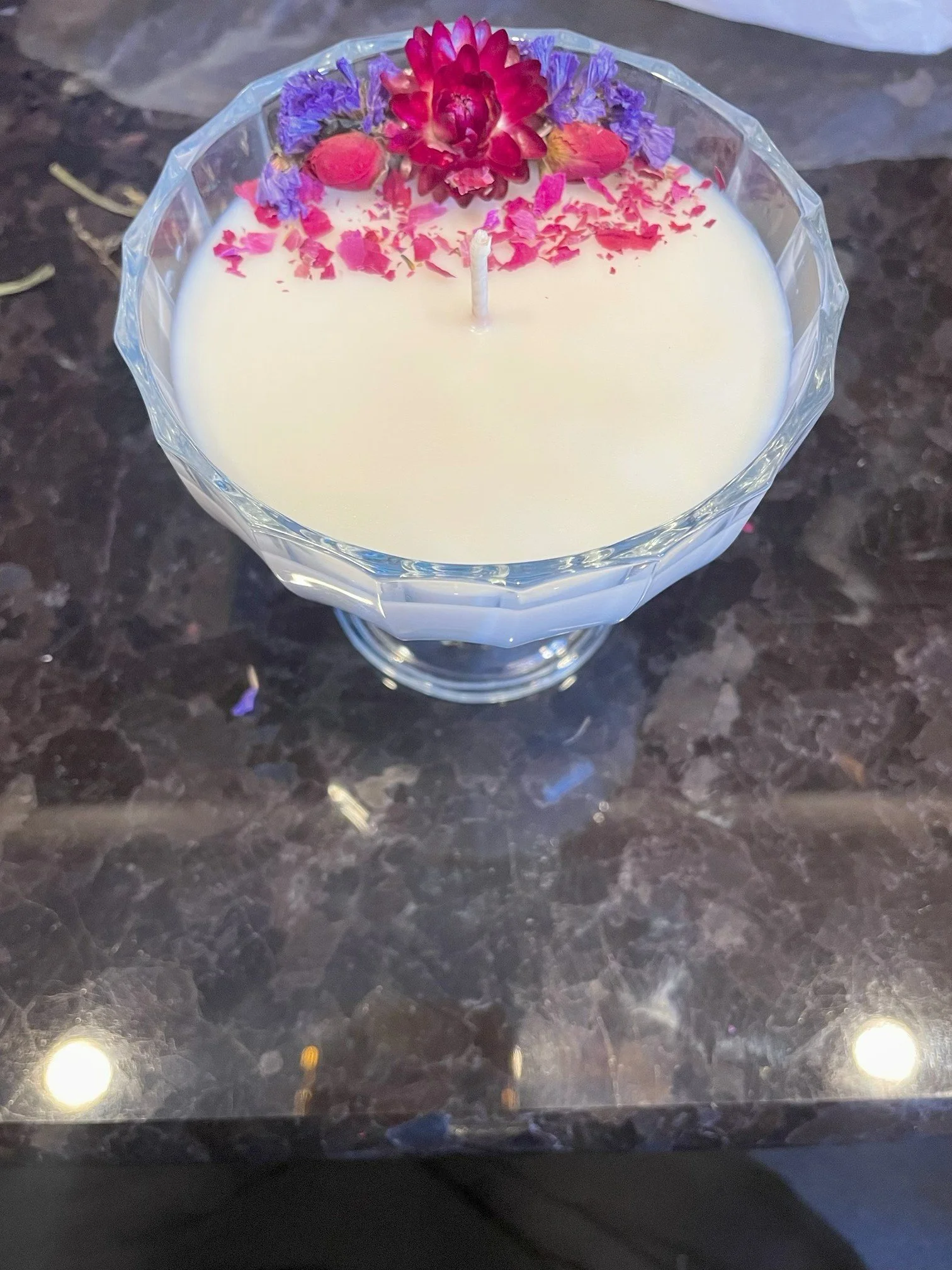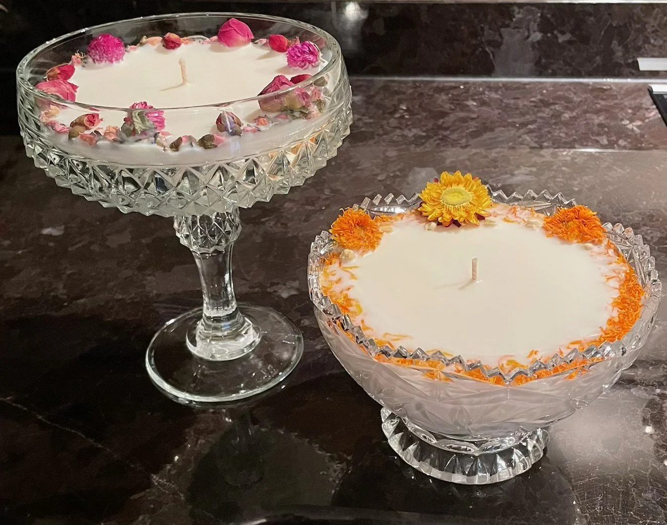 Each candle is individually hand poured and made of Natural Soy or Coconut Soy Wax by us.